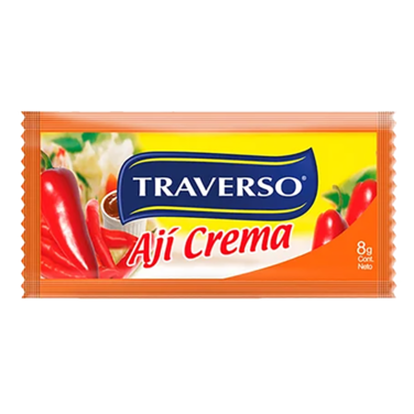 Ají Crema Traverso 50×8 g, pasta de ají suave y sabrosa, en prácticos sachets individuales que mantienen su frescura y sabor. Ideal para acompañar comidas, snacks y dar un toque picante a tus preparaciones en casa, restaurantes u oficinas.en casa, restaurantes u oficinas.